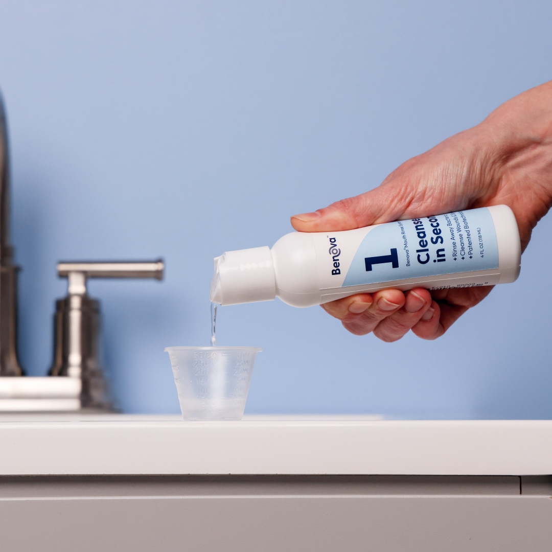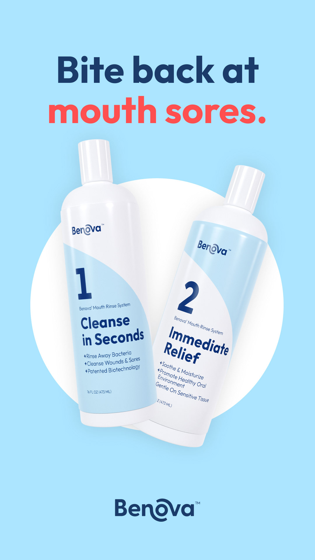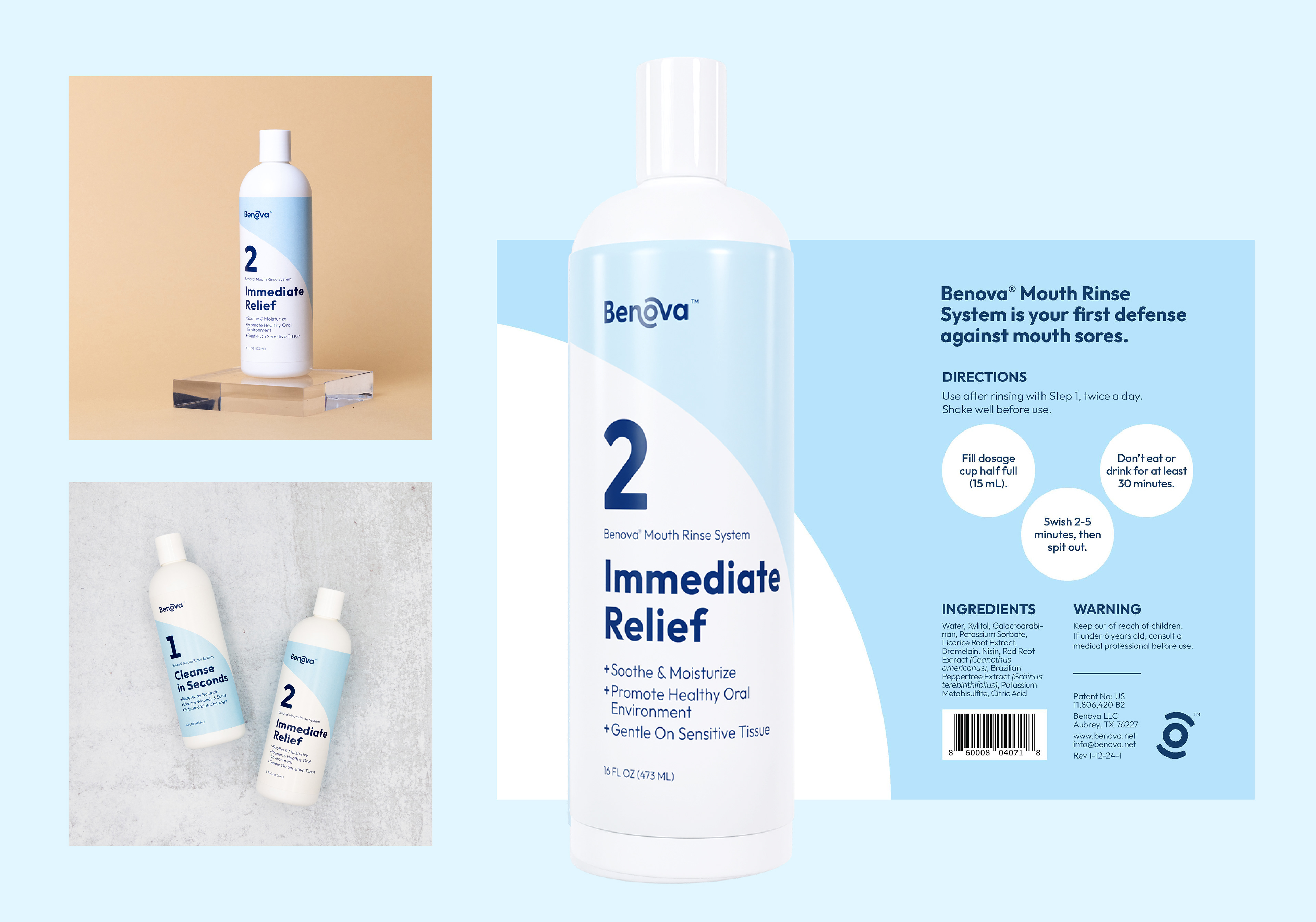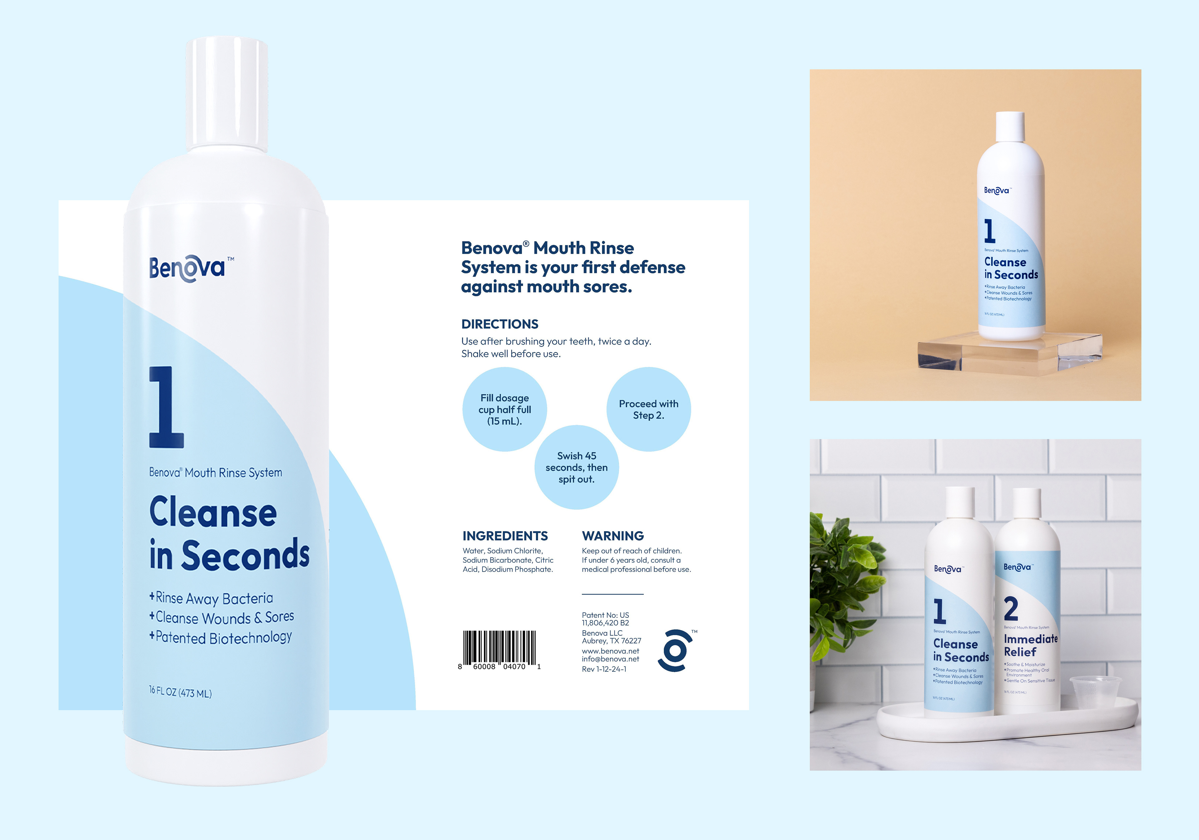 Brand identity, product photography, print labels, and ads for a medicinal mouthwash company.