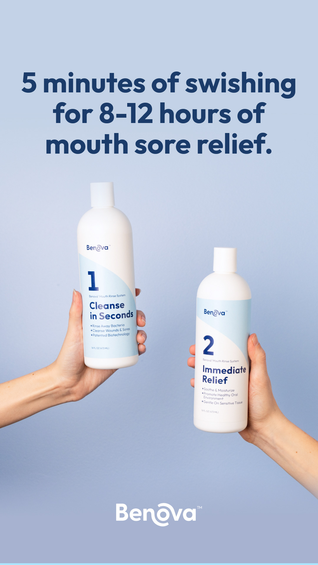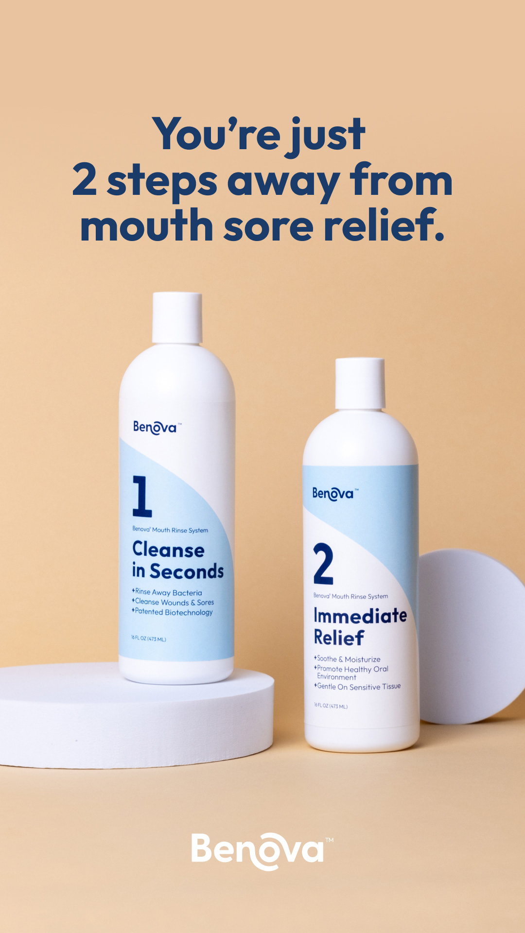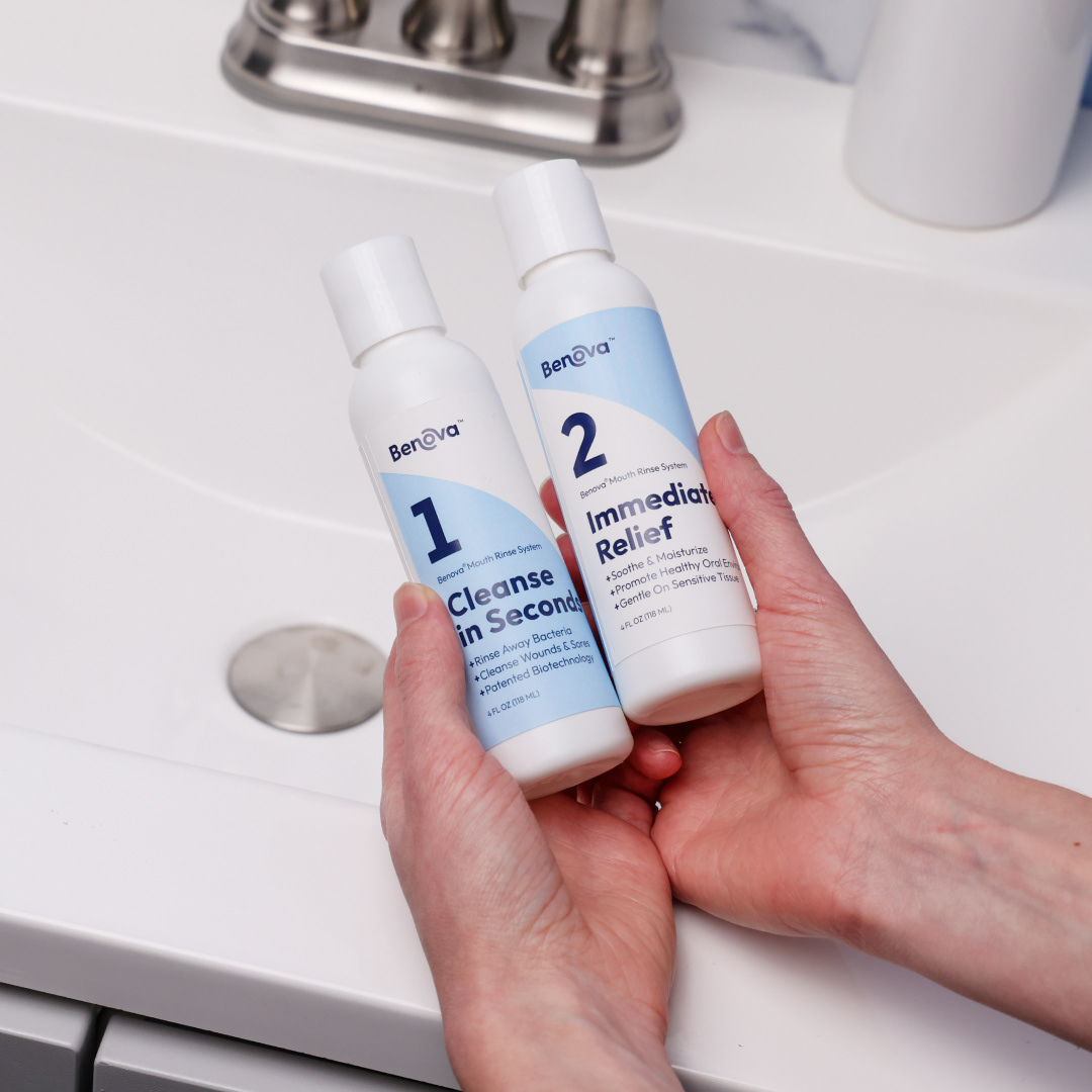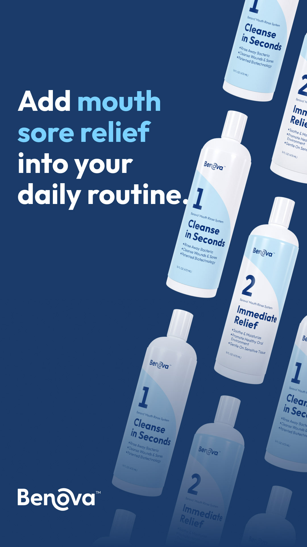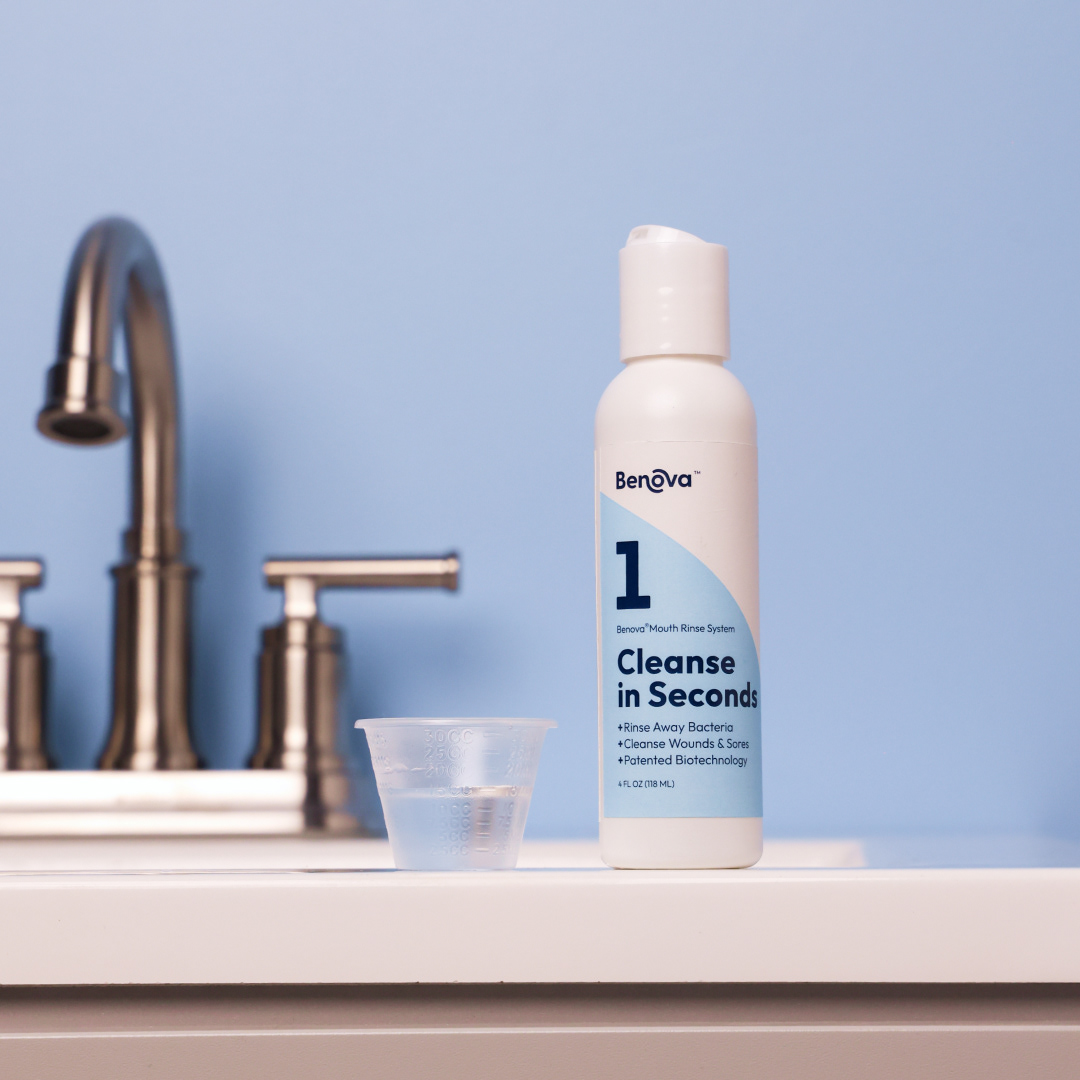 Brand identity, product photography, print labels, and ads for a medicinal mouthwash company.